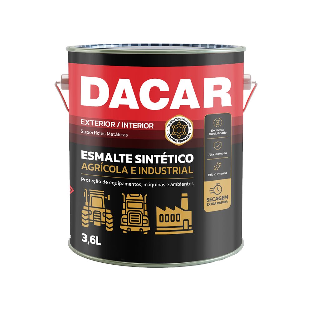 O Esmalte Sintético Agrícola e Industrial DACAR é indicado para a pintura de superfícies metálicas ferrosas, como implementos agrícolas, tratores e máquinas industriais, garantindo alta proteção às áreas aplicadas. O produto oferece fácil aplicação, excelente cobertura, ótimo rendimento e secagem extra rápida, disponível no acabamento brilhante.